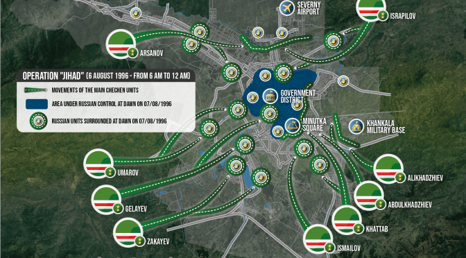 Supyan took part in Operation Jihad, the action with which the independence fighters recaptured the capital, putting the Russian army in check and forcing Moscow to withdraw from Chechnya. During the battle, he commanded several assault groups against the FSB headquarters, the “Government Palace,” the Dinamo Stadium, and other sensitive targets. For his role, he was apparently appointed ‘Brigadier General’ (a mainly honorary title, which would become rather inflated in the following years).