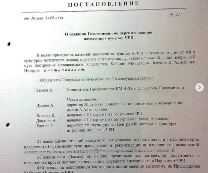 Nel dopoguerra le iniziative volte al recupero della tradizione nazionale nella denominazione degli insediamenti divennero molto frequenti, tanto che nel Marzo del 1999 il terzo presidente della ChRI, Aslan Maskhadov decise la creazione di un’apposita commissione, la Commissione di Stato per la Ridenominazione degli Insediamenti, al vertice della quale nominò il Ministro della Cultura Akhmed Zakayev. A far parte della Commissione furono chiamati anche Dalkhan Khozaev, Capo del Dipartipento Archivistico di Stato, Aslambek Davdiev, capo del Dipartimento Gioventù e Turismo, A. Dudaev, Direttore del Centro di Studi Culturali e Politici “A. Avtorkhanov” e Magomed Khasiev, Direttore del Centro Etnoculturale Ceceno.
