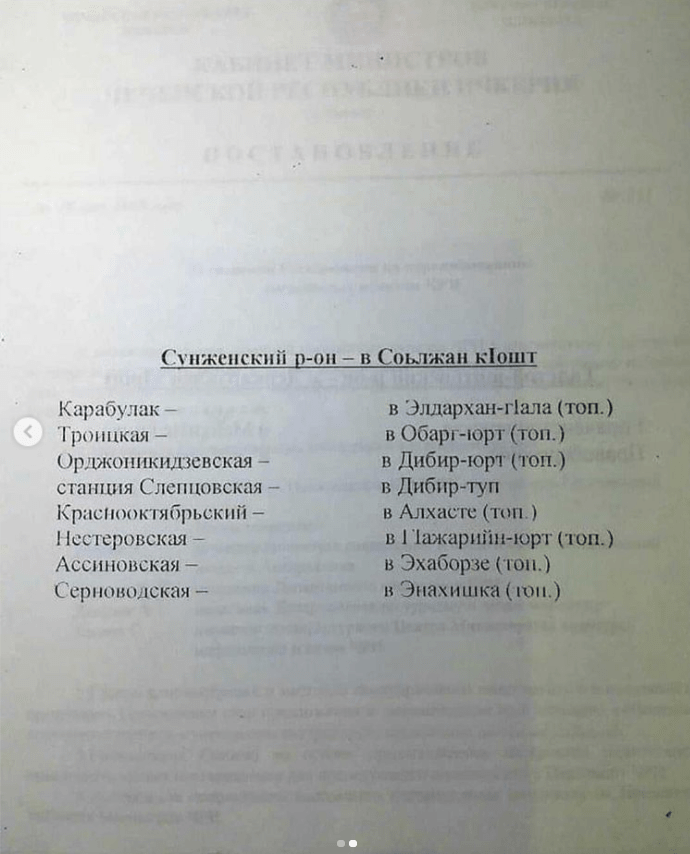 Recentemente ha iniziato a circolare sui social la foto di un documento, risalente al 10 Marzo 1999, nel quale la commissione decreta alcune ridenominazioni. Come vedremo si tratta di interventi messi in atto sugli insediamenti afferenti al Distretto del Sunzha, allora considerato per intero parte della ChRI, e successivamente diviso tra Inguscezia e Cecenia. La maggior parte degli interventi sono volti al recupero della denominazione indigena di quei villaggi. Le riportiamo di seguito: