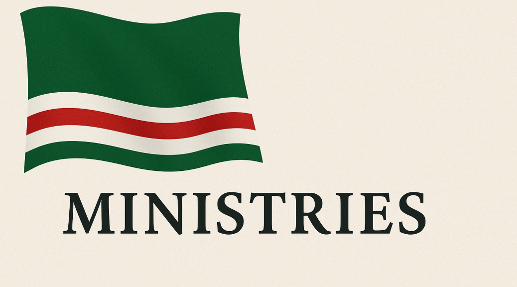 NOTA: istituito come Ministero degli Affari Interni, questo cambiò nome nel Maggio 1992 in “Ministero della Sicurezza dello Stato” a seguito del tentato colpo di Stato del 31 Marzo 1992. Nel Maggio del 1994, a seguito della “Normalizzazione” conseguente il golpe del 04/06/1993. Dopo la Prima Guerra Cecena la penetrazione degli elementi confessionali nelle istituzioni dello Stato si riconobbero anche in questo ministero, che fu ridenominato “Ministero della Sharia per la Sicurezza dello Stato”. Tale denominazione rimase fino al 2011, quando l’attributo confessionale venne rimosso dai documenti ufficiali, riportando la denominazione a “Ministero della Sicurezza dello Stato”. Rispetto a quanto citato nell’elenco, alcune fonti fanno figurare “Ministro della Sicurezza dello Stato” Turpal Ai Atgeriev, precisamente al 14/03/1999. Tale informazione non è tuttavia verificata.