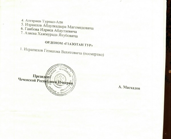 In 1998, this was followed by the title of “Son of Liberty,” awarded to Chechen or foreign citizens who distinguished themselves for exceptional merits in the construction of the independent Chechen state.