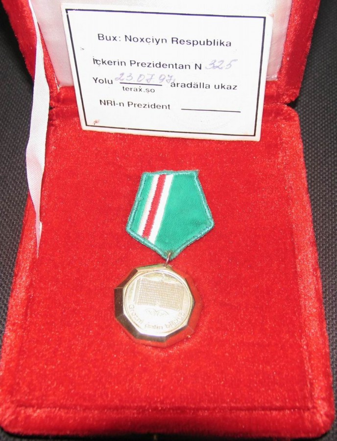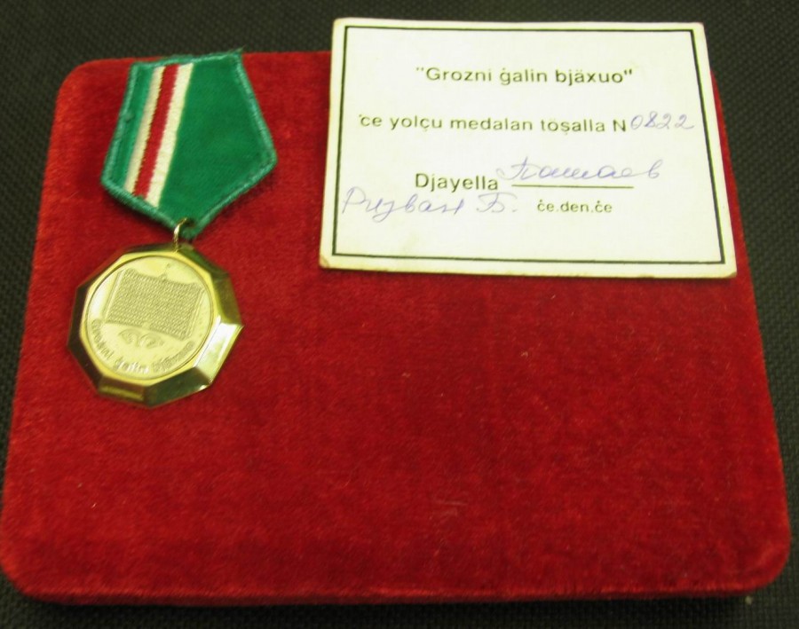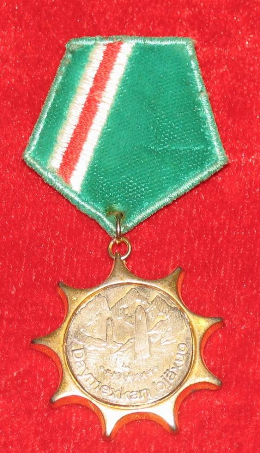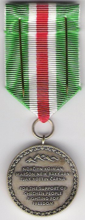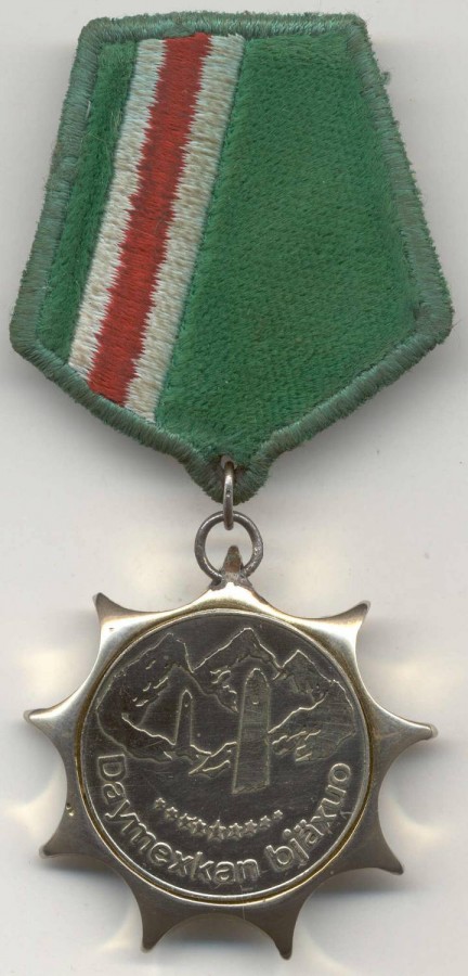 Award established for civil merit on April 10, 1997, on the first anniversary of the death of President Dudaev (who died on April 21, 1996). It was divided into three grades (Gold, Silver, Bronze). There is no information regarding its awarding. It was intended for “active participants in the political processes of forming and defending the independence of the Chechen Republic of Ichkeria, as well as persons who provided active moral, material, and political support for the independence of the ChRI.” The medal was awarded by a commission composed of members of the Assembly of Political and Social Parties and Movements for the Independence of the Chechen Republic of Ichkeria, representatives of the Ministry of Foreign Affairs, and the Congress of the Vaynakh Diaspora in Russia.