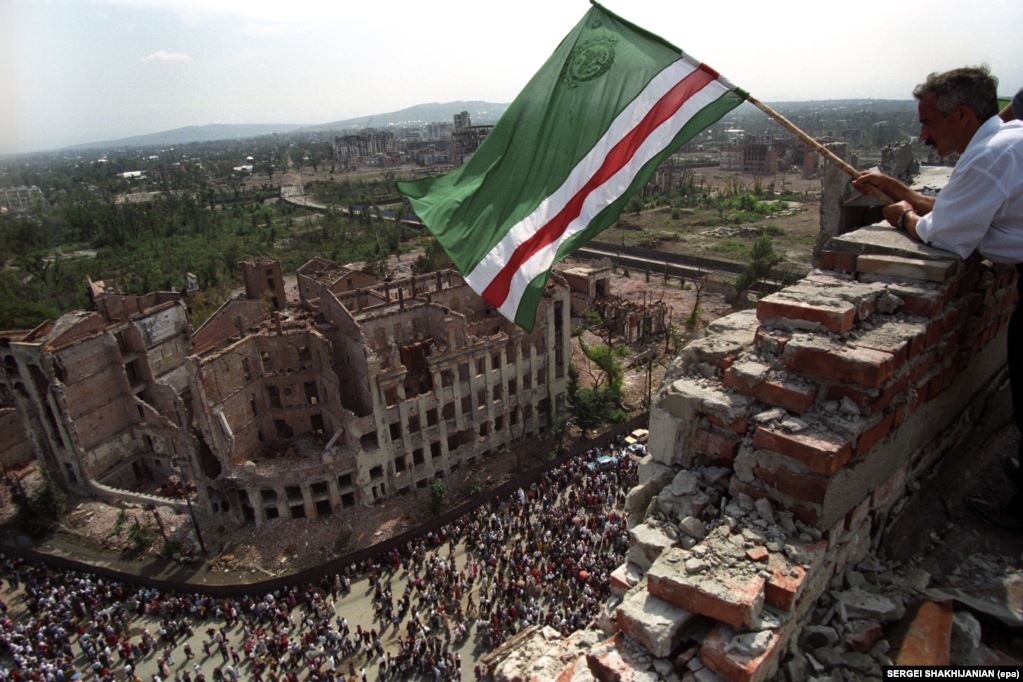 A boy waves the flag of Ichkeria in the ruins of Grozny