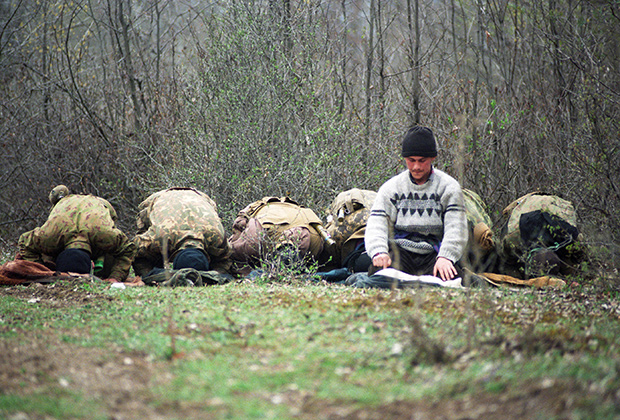 Miliziani ceceni pregano nel bosco